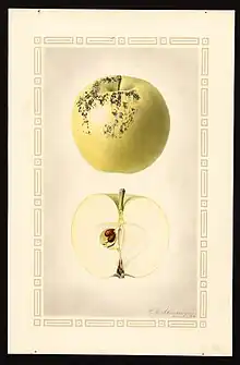 Steadman also made and painted hollow wax fruit models showing the characteristics of different cultivars for the USDA's permanent records.[3] In 1932, he patented a method for strengthening his wax models with plaster of Paris.[4][5] A small amount of liquid plaster would be injected through an inconspicuous hole in the fruit (with a second hole made for air release), after which the fruit would be rapidly rotated so as to create a thin, shell-like coating on the inside of the model.[4] Once the plaster dried and the holes were patched, the fruit became less likely to distortion when heated and less likely to break.[4] The added plaster also brought the model's weight closer to that of the original fruit, thus adding to the verisimilitude of the reproduction.[4]