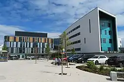 The hospital is accessible by public transport via local bus services[16] and there are several car parks on site.[16] Close proximity parking is available to pre-book, for those with a clinical need.[16] There are 112 disabled parking spaces on site.[16]