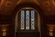 The eastern wing facing Queen's Park was designed by Alfred H. Chapman and James Oxley. Opened in 1933, it included the museum's elaborate art deco, Byzantine-inspired rotunda and a new main entrance. The linking wing and rear (west) façade of the Queen's Park wing were originally done in the same yellow brick as the 1914 building, with minor Italianate detailing. However, the Queen's Park façade of the expansion broke away from the heavy Italianate style of the original structure. It was built in a neo-Byzantine style with rusticated stone, triple windows contained within recessed arches and different-coloured stones arranged in a variety of patterns.[31] This development from the Roman-inspired Italianate to a Byzantine-influenced style reflected the historical development of Byzantine architecture from Roman architecture. Common among neo-Byzantine buildings in North America, the façade also contains elements of Gothic Revival in its relief carvings, gargoyles and statues. The ornate ceiling of the rotunda is covered predominantly in gold back painted glass mosaic tiles, with coloured mosaic geometric patterns and images of real and mythical animals.