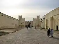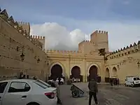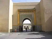 On the western side of the square is a gateway in the Italianate architectural style which belongs to the Makina (Dar al-Makina), a former arms factory (also called Dar al-Silah) established by Moulay Hassan in 1886 with the help of Italian officers.[6][1] Originally, though, this western wall was actually a large Marinid aqueduct built in 1286 to carry water to the Mosara Garden in the north; the faint outline of its arches can still be seen today within the structure of the wall.[3] The northern gate of the New Mechouar, known as Bab Kbibat es-Smen ("Gate of the Butter Niche"), also dates from the 1886 construction, though another gate called Bab Segma (formerly part of the Marinid gardens) also lends its name to the area.[6]