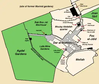 Although the original layout of the palace cannot be fully reconstructed due to centuries of subsequent expansion and modification, it was most likely concentrated further southwest within the current palace grounds.[3] What is now the Old Mechouar (a large walled courtyard preceding the main public entrance to the palace) was at that time a fortified bridge over the Oued Fes (Fes River) at the northern entrance to the city, and was most likely not directly connected to the palace itself.[3] In addition to the main palace structures at the center of the city, the palace was also flanked by a large park or garden area to the west which was characterized by elevated terraces and pavilions, most likely corresponding to the site of the present-day Lalla Mina Gardens in the current palace.[4]: 310 These first gardens were known as the "Agdal" (not to be confused with the current Agdal Gardens further west) and followed a tradition already established in Almoravid and Almohad times, as exemplified by the older Agdal Gardens of Marrakesh.[5][4] The western edge of these gardens was in turn bounded by the western walls of the city. A gate known as Bab Agdal still stands here today and preserves its old Marinid-era layout.[3]
