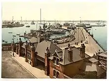 Over a two-year period starting in 1891 the pier was rebuilt in iron and the station was expanded to house two platforms and the facilities to allow the pier to be used as a pleasure pier added.[1] These facilities included a pavilion.[1] The money for the pier's expansion came from part of a loan of £100,000 taken out by the harbour board which was also used to pay for dredging.[7] The rebuilt pier was opened in 1902 by Prince Arthur, Duke of Connaught and Strathearn.[8] In 1894 the gatehouse was expanded and four years later a new pontoon was added to the pier enabling two steamers to be berthed simultaneously.[1] The addition of the new pontoon coincided with the pier being renamed to Royal Pier.[1]