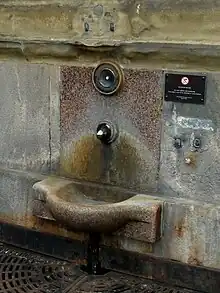 The Harrogate Improvement Commissioners Board's 1841 Harrogate Act established the principle that the poor should not be excluded from the perceived medicinal benefits of Harrogate's sulphur water. In order to conform to the act the Pump Room provided an outside tap which anyone could use at any time. After 9.30 am the Pump Room's attendants stopped serving well water inside the building. From this time onward the outside tap was the only source of well water. In the early days of the building an attendant supervised the tap.[14] This tap still exists today and it still works, although it is not recommended to try the water, due to the health risks involved.[12]