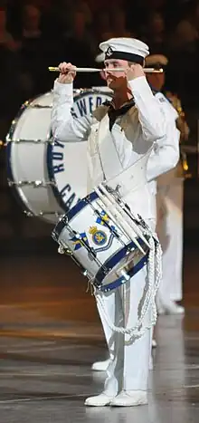 The First drummer, or Drum Major (Swedish: flaggtrumslagare) is the leader of the band during parades and figurative shows. The First drummer's tasks include rehearsal of marching exercise and figurative shows, for performances. The first drummer does not carry a drum; the title is better understood as the leader of the drummers (and as such of the band). The sign of command of the first drummer is the ceremonial mace, and by tradition, an ornate drum strap is carried across the shoulder as well.