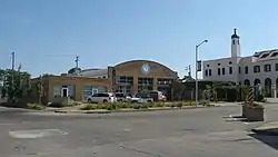 It was built for original use as a tire shop and gas station. It "is a spacious one story, L-shaped brick service garage with a barrel-vaulted roof above a central section that features an arched parapet. Five pass-through garage bays (with original overhead doors on the north (rear) elevation) are situated within the long (northern) leg of the L. A small office is located on the shorter east leg of the L, featuring a truncated southwest comer. Gasoline pumps have been removed, but the building itself and the way it frames its corner lot clearly illustrate the property's use as an automobile-related resource. Additionally, an abundance of historic material remains."[2]