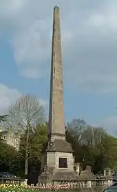 Inside the east entrance to the park on Marlborough Lane is the Grade II* listed Victoria Column, erected in 1837 to mark the coming-of-age (at age 18) of Princess Victoria. G. P. Manners, the Bath city architect, designed a tapering triangular stone obelisk, about 33 feet (10 m) tall. The triangular plinth has a low-profile relief of the Princess, and contemporary and later inscriptions on its other faces; radiating from it are three plinths bearing lions couchant. The whole is surrounded by a low balustraded wall. The unveiling of the monument took place on Victoria's coronation day, 28 June 1838.[4]