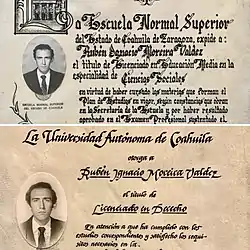 Rubén Ignacio Moreira Valdez (b. Saltillo, Coahuila, April 18, 1963) is a Mexican politician. He has a degree in Law from the Autonomous University of Coahuila (UAdeC) and in Social Sciences from the Superior Normal School of his state. He has a postgraduate degree in Politics and Educational Management at the Latin American Faculty of Social Sciences in Mexico and a master's degree in Governance and Human Rights at the Autonomous University of the Northeast. He has studied at the Universidad del Valle de Atemajac; the Carbonell Studies Center; the Monterrey Institute of Technology and Higher Education (ITESM); the Ibero-American University (UIA) and the University of Salamanca.