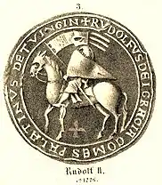 Next to his father, Rudolph II is the second most mentioned Count Palatine of Tübingen in imperial documents, mostly in documents by King Henry (VII) of Germany, the son of Emperor Frederick II, who had been elected King of Germany in 1220, at the age of 8. Frederick II spent much of his time in Italy, leaving his ancestral Swabia in the hands of his son. Later, in 1232, Henry revolted against his father, and did everything in his power to win the Swabian nobility over to his side. Rudolph II appears to have been among the noblemen who sided with Henry VII, at least, he is mentioned in 10 different documents of Henry VII and never by Frederick II. Considering Rudolph's energetic character, one can assume that he intended to use the conflict between Henry VII and Frederick II to expand his own power and aim at an independent position.[1]