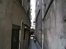 While the rue du Chat-qui-pêche is the narrowest street in Paris by overall width, it is not the narrowest by minimum width. Accordingly, the status of "narrowest" street in Paris is also conferred on the sentier des Merisiers in the 12th arrondissement, with a minimum width of 87 cm (2 ft 10 in),[1] and the passage de la Duée in the 20th arrondissement, which had a minimum width of 80 cm (2 ft 7 in)[2] before one side was redeveloped in 1970.[3]