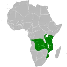 It is found in eastern, central and southern sub-Saharan Africa widespread although absent from the arid south-west and is found in Angola, Botswana, Burundi, Democratic Republic of the Congo, Eswatini, Kenya, Lesotho, Malawi, Mali, Mozambique, Namibia, Rwanda, South Africa, Tanzania, Uganda, Zambia, and Zimbabwe.
