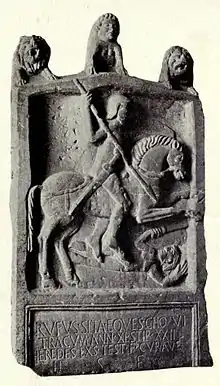 The tombstone is of a type typically used for Roman soldiers, depicting a horseman spearing a foe on the ground with an epitaph below stating the age and service of the deceased, his origins and who placed the tombstone.[2]