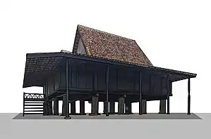 The proper house (dalam) has a square layout.[3] Construction method for the house involves placing a complete frame of the house on top of the posts. The layout is simple, with space divided into two different levels by a 15 centimetres (5.9 in)-high dividing beam (sengkar). The lower area (tempuan), about two-thirds of the total floor area, is where the entrance is located. The lower space is used to prepare and to consume food, with the hearth placed in one corner. In a larger house, the kitchen is located in an additional building known as the beruge. The higher one-third floor area (luan) marks the more private sleeping area. This higher area is also used as the place where elders, or members of the bridge-giving lineage, were seated. The word luan means "stern" of a boat.[2]