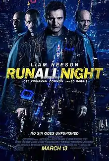 Run All Night is a 2015 American action thriller film directed by Jaume Collet-Serra and written by Brad Ingelsby. The film stars Liam Neeson, Joel Kinnaman, Common, and Ed Harris and follows an ex-Irish Mob hitman who goes on the run with his estranged adult son after he is forced to kill the son of a mobster boss. It also marks the third collaboration between Liam Neeson and Jaume Collet-Serra after Unknown and Non-Stop.