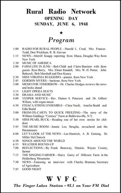 The Rural Radio Network's first day of operation was Sunday, June 6, 1948. According to a newspaper ad published the preceding day, the 1:00 PM inaugural program was a 15-minute feature entitled "Radio for Rural People", followed by a 15-minute newscast. Several more farm-related programs, interspersed with musical interludes, aired until sign-off at 7:45 that evening.
