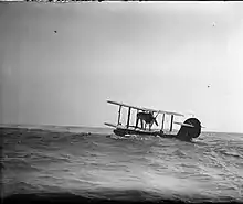 With his initiative approved, Aitken sourced a Supermarine Walrus,[10] a biplane amphibian having a crew of four and which had been in service with the RAF since 1933.[11] He then stationed himself off the Isle of Wight, on the south coast of England. Floating on the sea, he would wait for the dogfights to take place above him before taking off to retrieve any pilots who had ditched or bailed out. He was soon joined by a couple of other pilots, similarly operating Walruses but from the Royal Navy Air Station at Ford. These semi-official air-sea rescue services ended at the end of August, when Gosport and Ford were bombed. By this time, Aitken had been responsible for rescuing at least 35 pilots, both British and German.[8][12] His work helped lead to the development of the Air Sea Rescue Services which operated air-sea rescue squadrons for collecting RAF aircrew who had ditched in the sea.[13]