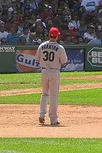 Branyan called the trade to Cincinnati "a clean slate" stating he had been branded as a home run or strikeout player in Cleveland.[20] He improved his numbers after the trade, but they still remained poor as he played left field opposed to his normal position at third base that was occupied by Aaron Boone.[21] On August 4, 2002, Branyan hit three home runs, two off Bobby J. Jones and one off Mike Holtz as the Reds beat the San Diego Padres.[22][23] He also hit two home runs on September 27, both off Montreal Expos pitcher Javier Vázquez.[24] He finished the 2002 season to hit a combined .228 with 24 home runs and 151 strikeouts between the Indians and Reds. Branyan was also praised for his improved fielding during his transition to the outfield.[25] At season's end, Branyan played winter ball in the Dominican Republic where on November 18, he injured his shoulder.[26] An examination with the team's physician discovered serious damage, and Branyan underwent arthroscopic surgery on this shoulder on December 3.[27]