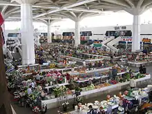 The Russian Bazaar or Gulistan (Turkmen: Gulistan söwda merkezi; Rus bazary, Гулистан сөвда меркези; Рус базары) in Ashgabat is one of the largest and oldest covered markets in the Turkmenistan. It is located in the centre of the city. The "Russian Bazaar" was built in the period of 1972—1982 by the design of the Russian architect Vladimir Visotin among other buildings that were included in the "Ashgabat Reconstruction Program of 1970-1980." The building was done in the Soviet Modernism style and decorated by the Turkmen sculptor Klych Yarmamedov who adored the building with a magnificent abstract sculpture placed in one of the building's corners. Despite the emergence of new stores and malls in Ashgabat, markets continue to be popular among locals and tourists and are regularly visited by foreign delegations. The range of goods is enormous, and the bazaar also houses shops and eateries. In 2001 it was reconstructed by the Turkish company Ekol, with updated outlets, shops and foodstalls.[1] The complex was covered with white marble. In 2007, there was a fire in the clothing section of the market.