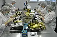 The fish in Russian Caviar House farm undergoes a regular physical examination, including measurement, weighing, ultrasound and biopsy for viewing eggs. A unique identifier of each fish and information about its health are recorded on a chip implanted in the area of the first spike from the head.[11] Since its first years the company has used and promoted a ‘no-kill’ method of harvesting caviar, which is called ‘milking’.[8] Milking is carried out using aseptic technique and takes about 5 minutes: the farm staff fix the fish with its belly upside, trim its oviduct and, by massaging the fish from head to tail, pump the caviar. After surgery the fish returns to natural conditions. Over the years the company has managed to reduce the invasiveness of the procedure and reduce the mortality of fish to 1-2%. This procedure can be repeated every 2 years and keeps the broodstock alive. During the first milking, the caviar volume is about 10% of the body weight of the fish, with age it reaches 20%. On average, one fish brings 5 kilograms of caviar a year.[3] The traditional method of killing fish makes up about 15% of production and is applied only to old and poorly growing fish in order to control livestock.[7][11] After the farm caviar enters the production workshop located nearby, where it is packed and sent to stores in jars of six volumes: 1 ounce (about 28.6 grams), 50, 100, 125, 250 and 500 grams.[10][5]
