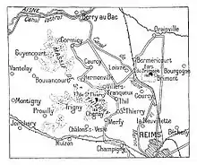 On 11 March the 1st Russian Brigade relieved the 152nd French brigade in the Courcy sector, just to the north of Reims[7] They were part of Mazel's Fifth Army and took their place in the frontline, where they suffered casualties in the run up to the Nivelle Offensive. On 15 April, on the eve of the Second Battle of the Aisne, the Russian soldiers received news of the February Revolution in Russia. They formed a soviet and debated whether to participate in the battle the next day, agreeing to do so by a small majority. Thus the next day, 16 April 1917, the 1st Brigade took part in the battle and took Courcy, just to the north of Rheims.[7] On 23 April the 1st Infantry Brigade transferred to the Châlons-sur-Marne area, overseen by général Henri Gouraud of the French Fourth Army. French President Raymond Poincaré, impressed by the state of the Russian camp, awarded General Lokhvitsky the Commander of the Legion of Honor. The 1st Brigade was then re-deployed further east up the Marne valley between Suippes and Auberive at the end of June 1916.[1]