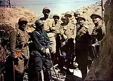 In July and August additional Russian volunteers, mainly veterans of the former Expeditionary Force, enabled the Russian Legion to become first a brigade and then a regiment with a total of 21⁄2 infantry companies as well as a mortar unit. The unit was assigned to the vicinity of Laffaux.[1] On September 12 the regiment penetrated three lines of fortifications despite heavy losses and were awarded a special flag by the Commander of the French Army, Marshal Ferdinand Foch as well as attracting more volunteers. By November 1, 1918, the regiment had 564 men comprising a machine gun company and three infantry companies.[1]
