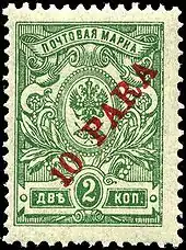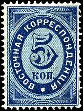 The first postage stamp of the offices was a large square design issued in 1863 and valued at six kopecks. This type is today rare, as were the normal-sized 2k and 20k stamps issued in 1865, which included a sailing ship along with the imperial coat of arms, and "ROPiT" in the inscription. A similar but better-executed design appeared in 1866.