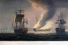 Vsevolod burning, after the action with Implacable and Centaur, destroyed in the presence of the Russian Fleet near Rogerwick bay on 26 August 1808.