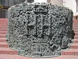 The cylinder-shaped sculpture, which serves as the outer wall of the fountain basin, features bas-relief scenes of San Francisco, "whimsically interrelated".[1] It measures approximately 90 inches (2.3 m) tall, with a diameter of 193 inches (4.9 m), and is set into a base of brick stairs. Albert Lanier served as the architect; credited assistants include Aiko Asawa, Haru Awara, Mae Lee, Mei Mei, Hector Villanueva, and Sally Woodbridge.[1]