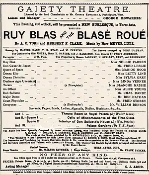 After a tryout in Birmingham beginning on 3 September 1889, Ruy Blas and the Blasé Roué opened in London on 21 September 1889 at the Gaiety Theatre and ran for 289 performances. The cast included Nellie Farren, Fred Leslie, Marion Hood, Letty Lind, Sylvia Grey, Linda Verner, Blanche Massie, Alice Young, Charles Danby, Fred Storey and Ben Nathan.[1] The piece toured in the British provinces and internationally, and was revised at least once during its run. It originally included a caricature of Henry Irving, in a scene in which some of the actors wore ballet girl costumes. Irving, never having seen the show, objected, and the Lord Chamberlain (Britain's theatrical censor, who also had not seen the show) prohibited the caricature.[2]