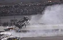 On February 17, 2020, when leading on the final corner of the final lap of the 2020 Daytona 500, Newman's car was tapped in the rear by Ryan Blaney who was running second. Newman's car veered across the track and bounced off the outside wall, rolling over onto its roof and turning the driver's side toward Corey LaJoie's onrushing car. The violent collision caused Newman's car to roll over again and it slid upside down in a shower of sparks and flames across the finish line in ninth position, coming to a stop hundreds of yards away from the impact. LaJoie's car suffered hood damage and caught fire, but he appeared unhurt. It took nearly 15 minutes to extract Newman from the wreck and put him in an ambulance before he was taken to Halifax Medical Center. He sustained serious but non life-threatening injuries.[33][34] Over the next two days, RFR provided updates on Newman's recovery, culminating in his release from the hospital on February 19, walking unaided.[35][36][37] Ross Chastain replaced Newman in the No. 6 starting with the Pennzoil 400 at Las Vegas.[38] On February 23, 2020, a statement was released detailing Newman's status, revealing that he suffered no broken bones but was recovering from an unspecified head injury.[39] There was no timetable for Newman's return to resume his seat upon his hospital release, subject to his rehabilitation.[38] Three weeks after the crash, Newman made an appearance at the Phoenix race, stating he believed his survival was a miracle having looked at the state of the wreck afterwards.[40] Newman would later hold an interview with Today on March 11 where he discussed the crash, revealing he was knocked out and sustained a bruised brain. When asked about returning to racing, he stated "as soon as I possibly can".