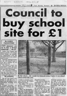 Rykneld Secondary Modern School was a secondary modern school for boys on St Albans Road Derby. It merged with Bemrose School in 1975, and admitted girls, becoming a comprehensive school. The single-storey brick building had a prominent clock tower, and was set in grounds that included tennis courts and football field at the rear. After-school activities included gardening and bee-keeping. The site and buildings, which had remained empty for some time and become vandalised, were sold for £1 in 1996 and the buildings demolished to make way for a new infants school. Attendees at the original Rykneld school had failed the 11-plus examination then in operation, and would leave without GCE or other qualifications, unless they passed the 13-plus examination entitling them to attend a Grammar School.