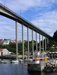 The Sørsund Bridge (Norwegian: Sørsundbrua) is a bridge that crosses the Sørsundet strait between the islands of Kirkelandet and Innlandet in the town of Kristiansund which is in Kristiansund Municipality, Møre og Romsdal county, Norway. The 408-metre-long (1,339 ft) bridge has 19 spans, with a main span of 100 metres (330 ft). The bridge opened in 1963 and it carries County Road 420.[1][2]