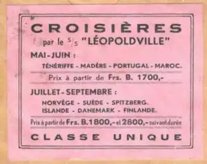 She was built for the Compagnie Maritime Belge as the fifth to bear the name Léopoldville and initially served on the route between Belgium and its African colony, the Belgian Congo.[5] Her Belgian Official Number was 120. Her code letters were MLTP[2] until 1933–34, when they were superseded by the call sign ONLB.[3]