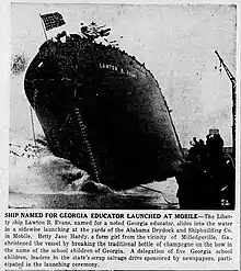 SS Lawton B. Evans was a Liberty ship, with hull number 'MCE 746'. She launched at Alabama Drydock and Shipbuilding Company on January 1, 1943, sponsored by Betty Jane Hard, Winner of Scrap Metal Drive, Milledgeville, Georgia. The cosponsor was Mrs. E. D. Veal, Principal of Midway School, Milledgeville, Georgia.[3][4]