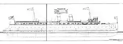 Her steel hull had an overall length of 350 feet (106.68 m) (one source states 358 feet, 109.12 m), and a keel length of 338 feet (103 m).[3][7][5][14] Her beam was 56 feet (17 m) (one source states 57.6 feet, 17.6 m) wide, and her hull was 19.42 feet (5.92 m) (some sources also state 19.5 feet, 5.9 m, 19.6 feet, 6.0 m, 20 feet, 6.1 m or 21.7 feet, 6.6 m) deep.[3][4][6] She had a gross register tonnage of 2,909 tons, and a net register tonnage of 1,722 tons (other sources also state that she had a gross register tonnage of 2,777 tons and a net register tonnage of 1,660 tons, a gross register tonnage of 2,775 tons and a net register tonnage of 1,685 tons or a gross register tonnage of 2,443 tons).[3][4][5][15][7]