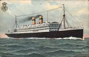 Tubantia worked KHL's route between Amsterdam and Buenos Aires. When the First World War broke out in August 1914, she was returning from South America with £500,000 in gold destined for banks in London, much of which for the German Bank of London.[8] She was also carrying about 150 German reservists in steerage and a cargo of grain destined for Germany.[8][9] After she called at Vigo, Spain, the Royal Navy cruiser HMS Highflyer stopped Tubantia, put a boarding party aboard her,[9] and escorted into Plymouth.[8] There, Royal Marines disembarked the German reservists,[9] and the gold was confiscated and taken ashore.[10] Tubantia was released then from Plymouth and allowed to resume her voyage.