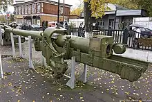 The project was designated "KV-14"[7] and assembly of the first prototype (called "Object 236") began on December 31, 1942. It was completed after 25 days. Plant trials of "Object 236" began on January 25, 1943. After a number of successful plant tests the more stringent state tests began. "Object 236" succeeded again. On February 14, 1943 the State Defense Committee accepted it for Red Army service and immediately launched it into mass production at the Chelyabinskiy Kirovskiy Zavod (Chelyabinsk Kirov Plant, ChKZ). The designation of the series of self-propelled guns was changed from KV-14 to SU-152. The ML-20 gun was slightly modified for mounting in the SU-152 — some handles were moved for improved gunner comfort. This variant had the designation ML-20S. The muzzle velocity and external ballistics were identical to the original towed ML-20 gun.