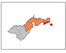 Map of Tutuila where Saʻole County is highlighted in red, while the Eastern District is marked in orange.
