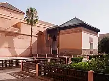 The eastern building of the necropolis is the older of the two main buildings in the necropolis. It is often referred to as the Qubba of Lalla Mas'uda (qubba being an Arabic word for a mausoleum, usually domed).[7][4][11] It consists of a small central square chamber (the so-called Chamber of Lalla Mas'uda), two rectangular loggia rooms on either side to the east and west, and a large rectangular chamber to the south (the so-called Grand Chamber) which connects directly to all three. In addition to the two loggias which open onto the gardens, there is an opening (a door or a former window) on the southern side of the large southern chamber. This unusual and almost symmetrical layout is believed to be the result of at least two different construction phases: a square mausoleum originally erected over the tomb of Muhammad al-Shaykh by Moulay Abdallah al-Ghalib and an expansion by Ahmad al-Mansur which added the other chambers around it (see history section above). The bulk of the building is built in brick.[4] The decoration, also believed to be from al-Mansur's time, is of high quality throughout, even though some scholars believe the decoration was left unfinished when Ahmad al-Mansur stopped working on this building and began constructing the western mausoleum.[7]