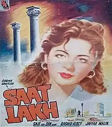 Saat Lakh (lit.'Seven Lakh') is 1957 Pakistani Urdu film directed by Jaffer Malik and produced by Saifuddin Saif. It stars Sabiha Khanum and Santosh Kumar in the lead with supporting role by Nayyar Sultana and guest appearance by Neelo. The film is primarily known for its blockbuster music composed by Rashid Attre.[1]