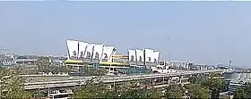 The integrated multi-modal passenger and transport terminal building, with the Red Line (Line 2) of Ahmedabad Metro visible in the foreground. Also visible is the AEC metro station in the right side of the image, on the metro line.