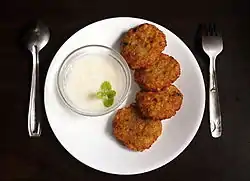 Sabudana vada, also called 'sabu vada', is a traditional deep-fried fritter from Maharashtra, India. It is made from tapioca pearls (sabudana), mashed potatoes, peanuts and spices.[1] It is often served with a spicy green chutney along with hot chai and is best eaten fresh.[2] In other parts of the country, Sabudana vada is the best option to have when fasting. It's usually eaten during religious festivals and during fast/vrat/upvaas, especially in Navratri vrats. Like all vadas, these are best eaten fresh. Sabudana vadas are crunchy and "melt in the mouth."[3]