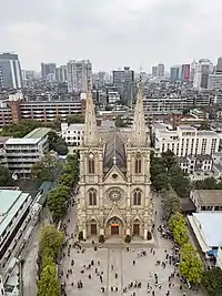 The Sacred Heart Cathedral, properly the Cathedral of the Sacred Heart of Jesus and also known as the Stone Chamber or Stone House by locals,[2] is a Gothic Revival Roman Catholic cathedral in Guangzhou, China. It is the seat of the Archbishop of Guangzhou. The cathedral is located at 56 Yide Road (in Chinese: 一德路56号), on the north bank of the Pearl River at the heart of the old town. It is one of the few cathedrals in the world to be entirely built of granite, including all the walls, pillars, and the twin towers.