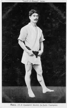 Sadakazu Uyenishi (上西 貞一, Uenishi Sadakazu, 1880–?[lower-alpha 1]) also known as S. K. Uyenishi and under the stage name Raku, was a jujitsu practitioner, a professional wrestler and a figure of London Edwardian establishment from 1900 to 1908. He was one of the first Japanese jujitsu practitioners to both teach jujitsu and to compete using the art outside Japan. Uyenishi is credited with introducing jujitsu to the British army and police and with opening the first jujitsu dojo in the U.K known as the School of Japanese Self Defence.[1]