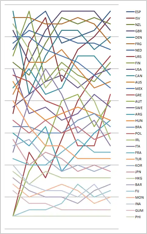 Graph showing the daily standings in the Finn during the 1988 Summer Olympics