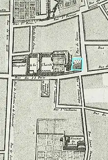 The Saint-Germain Cemetery (cimetière Saint-Germain) or Saint-Pierre Cemetery (cimetière Saint-Pierre) was a rectangular cemetery in Paris, first attested in 1259 and used by Protestants from 1598 to 1604 onwards. It was sited in the north-west corner of the former rue Taranne and rue des Saints-Pères, alongside the chapelle des Saint-Pères (on the site now occupied by square de la Charité at 186 boulevard Saint-Germain.[1] It measured 27 toise by 8 toise (54 by 16 m (177 by 52 ft)). Its site is now covered by Square Taras-Chevtchenko.