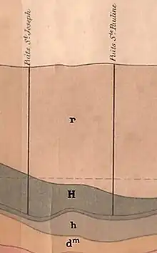 Geological cross-section of the Saint-Joseph shaft (left): r: red sandstone; H: upper coalfield; h: carboniferous terrain; dm: metamorphic terrain.