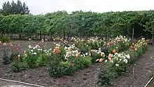 Like most of the Loire, the main red grape of Saint-Nicolas-de-Bourgueil is Cabernet franc (known locally as Breton) with Cabernet Sauvignon accounting for an increasing amount of plantings. Vineyards are densely planted with 5000 grapevines per hectare.[4] Both Cabernet varieties are usually trained to the guyot simple system with one long cane pruned to seven or eight buds each winter. Both grapes are late-ripening varieties that require a long growing season ideally ending with an Indian summer in order to achieve full ripeness.[1]