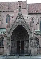 - Between 1897 and 1901, the church, which had fallen into disrepair, was fundamentally overhauled by the Karlsruhe architect Carl Schäfer, one of the most important representatives of neo-Gothic sacred architecture in Germany. At that time, the entrance was moved to the side and a new main portal was created, a copy of the northern entrance of the facade of the Strasbourg Cathedral. The cloisters were painted in polychrome, following the example of the Hortus Deliciarum.[7] The life-sized baptismal angel statue, along with the chapel and the choir glass windows,[8] also date from this time.