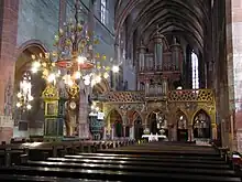 - The Gothic main building, with its numerous chapels and the lavish rib vault[3] dates from the 14th century. There are many frescoes from this time and the following one-and-one-half centuries,[4] memorial slabs and monuments, the baptismal font,[5] the central painting of the high altar[6] and the choir screen, now unique in Alsace, which have also been maintained.