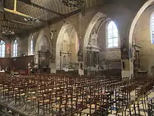 The nave is 14 metres (46 ft) wide and lit by narrow, spaced windows.[11] It is topped by an inverted ship-shaped roof with parquet flooring.[12] The north-side chapels are integrated into the nave, while those on the south side are covered by a small roof, with an octagonal gable following the gradient of the nave roof.[13]